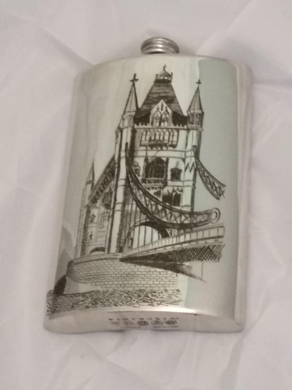 The engraving of Tower Bridge is an unusual view, but I had to get this sort of view to fit it on the flask.