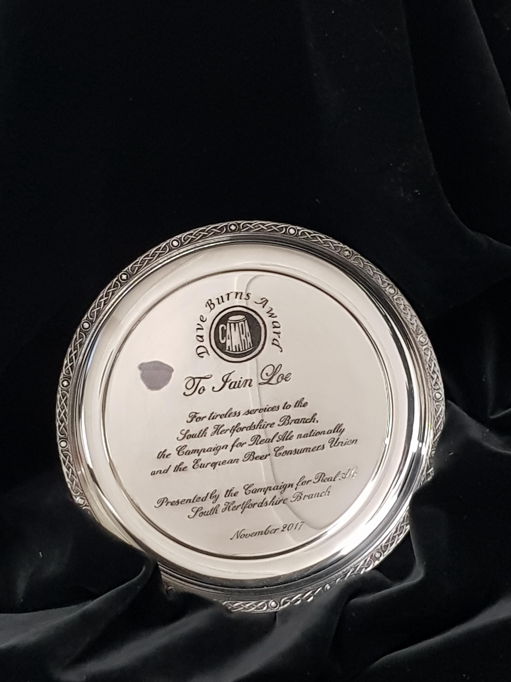 The Pewter pint glass was engraved in the workshop, with additions to the engraving while I was on show, again in Manchester.