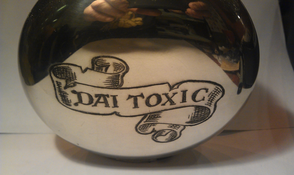The Dai Toxic design was engraved on a 4oz round flask, at a beer festival.
