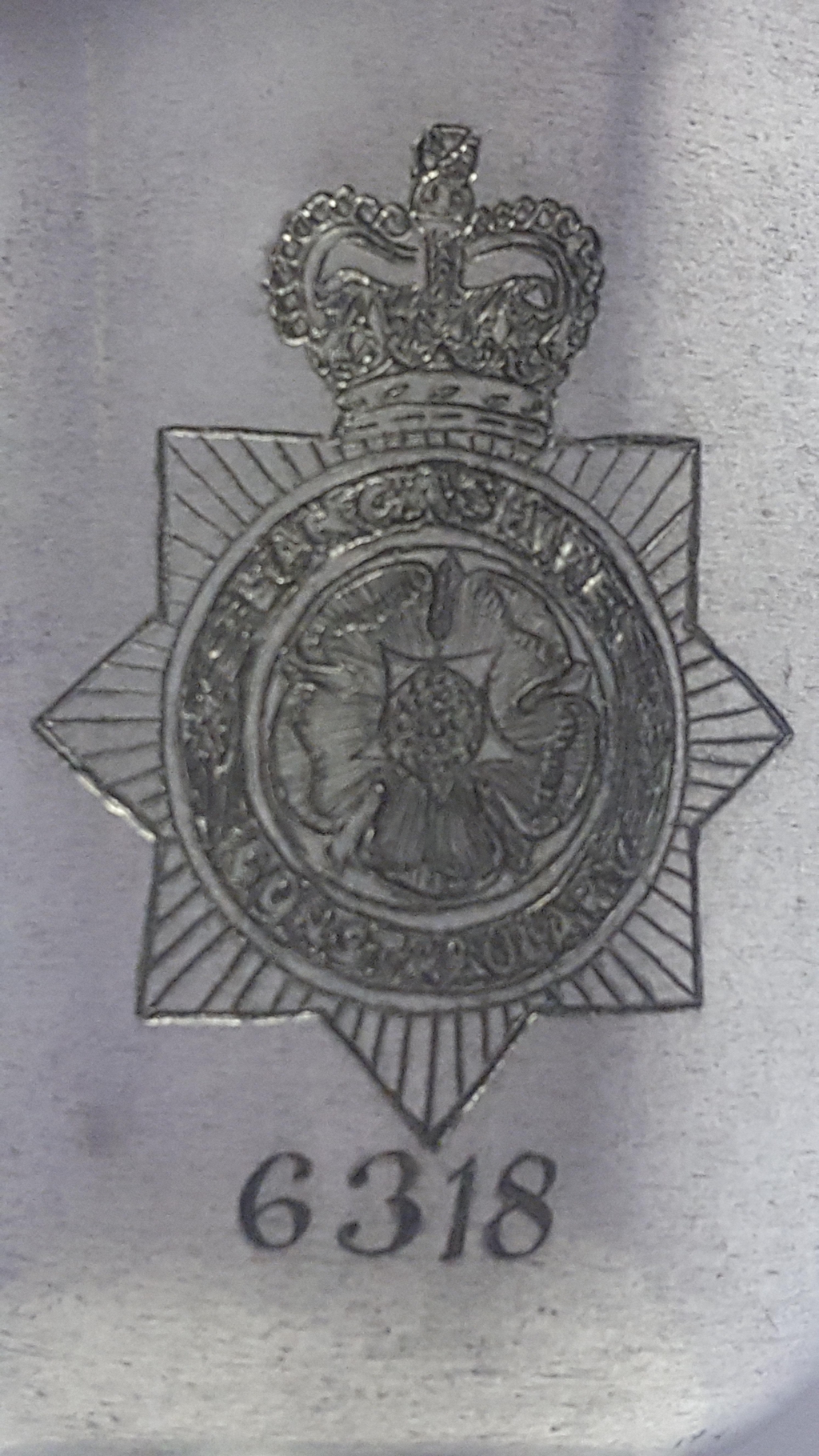 The Police badge was engraved on a cast pewter Goblet as a retirement present.