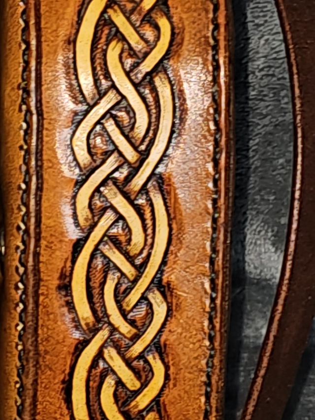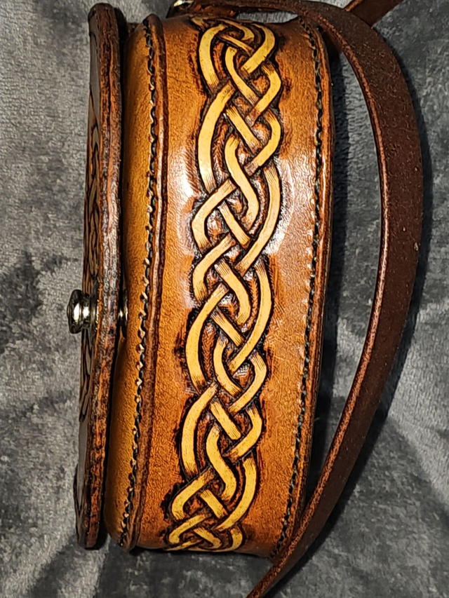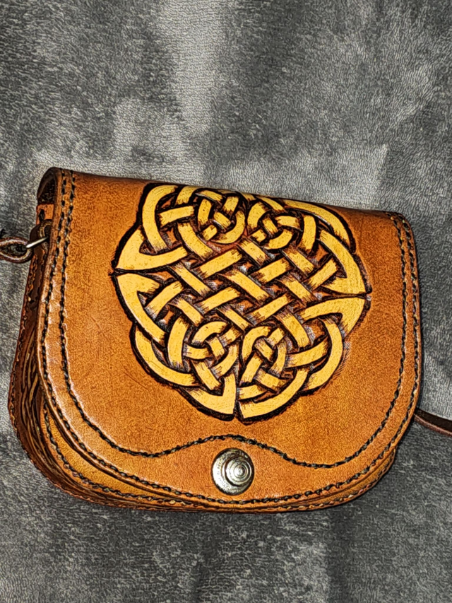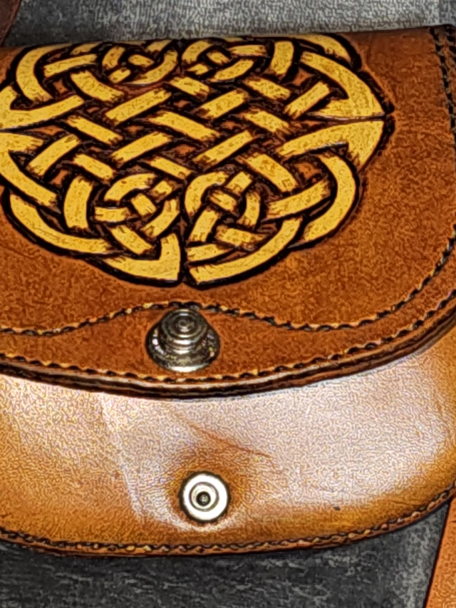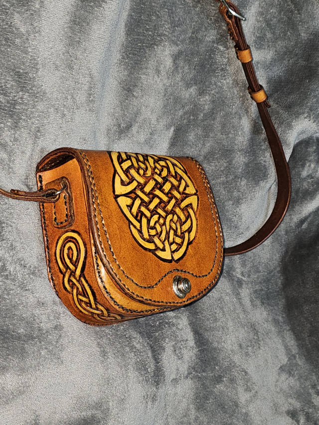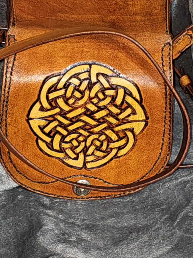 This Beautiful Traditionally made Saddle style handbag is fully handmade, from the cutting of the individual pieces to the final stitch. The exquisite hand carving is the perfect example of this traditional skill, taking our Craftsman in excess of 6 hours to complete. The process requires an ability to focus on a small area for long periods. While this saddle bag is one of the standard pieces we make, we happy to discuss the same style handbag with a your bespoke design. Natural water based stains are used to achieve the colour and the piece is finished with beeswax. The saddle bag is approximately 7" (17.5cm) across and 6" (15cm) high, the depth is 2.5" (6.2cm), and the strap is 50" (125cm) long with 6" (15cm) of adjustment, so suitable to be worn across the body. The closing mechanism is a "tenax" fitting, which is normally found on high end sports cars.